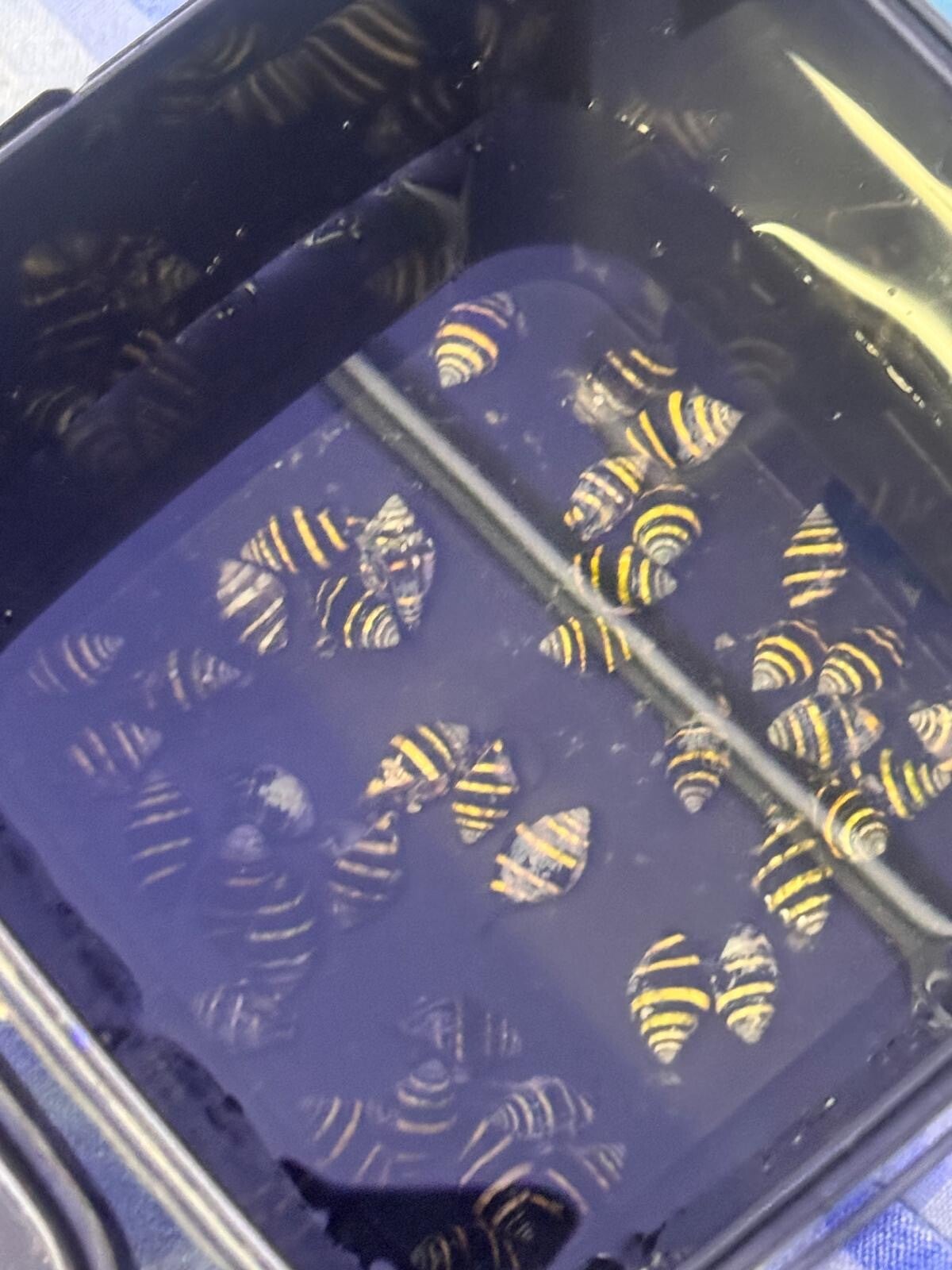 Die Engina mendicaria, auch bekannt als Hummelschnecke oder Bubble Bee Schnecke, ist eine kleine, auffällige Meeresschnecke, die durch ihr schwarz-gelbes gestreiftes Erscheinungsbild sofort ins Auge fällt. Mit einer Größe von bis zu 2 cm ist sie perfekt für kleine Aquarien und Nanobecken geeignet.